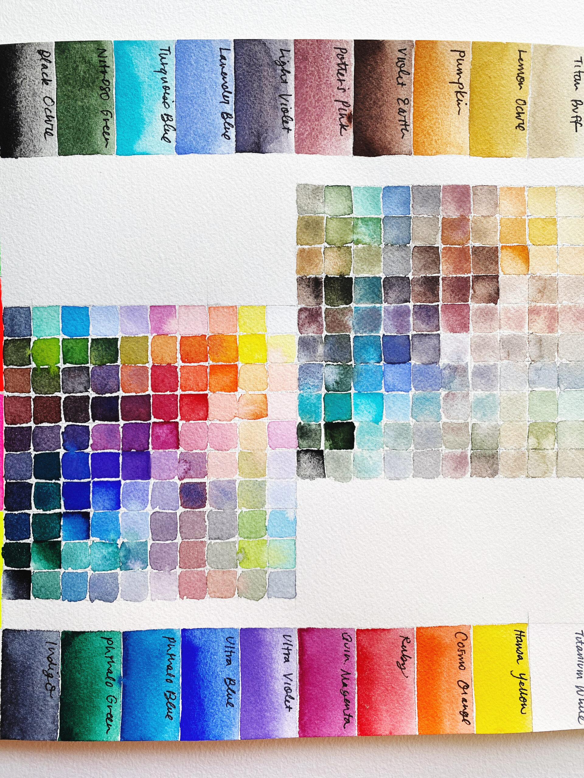 - Bottom row earth rainbow to line up with top row: titan buff, lemon ochre, pumpkin, violet earth, potter’s, light violet, lavender blue, turquoise, nitroso green, black ochre